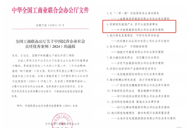 近日,全國工商聯發布《中國民營企業社會責任報告(2024)》,并公布“中國民營企業社會責任優秀案例(2024)”名單。題為《深耕綠色建筑產業,堅守公益慈善事業》的中天控股集團社會責任案例榮譽登榜。